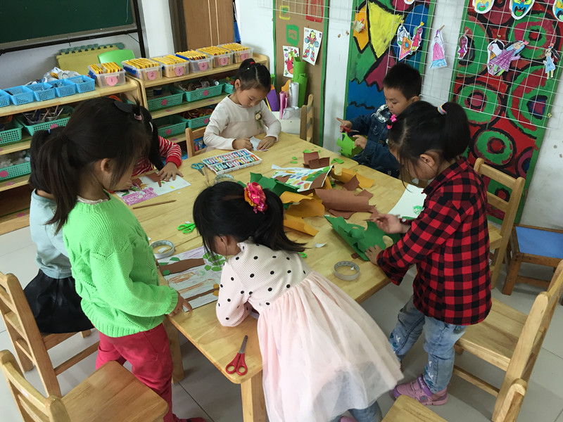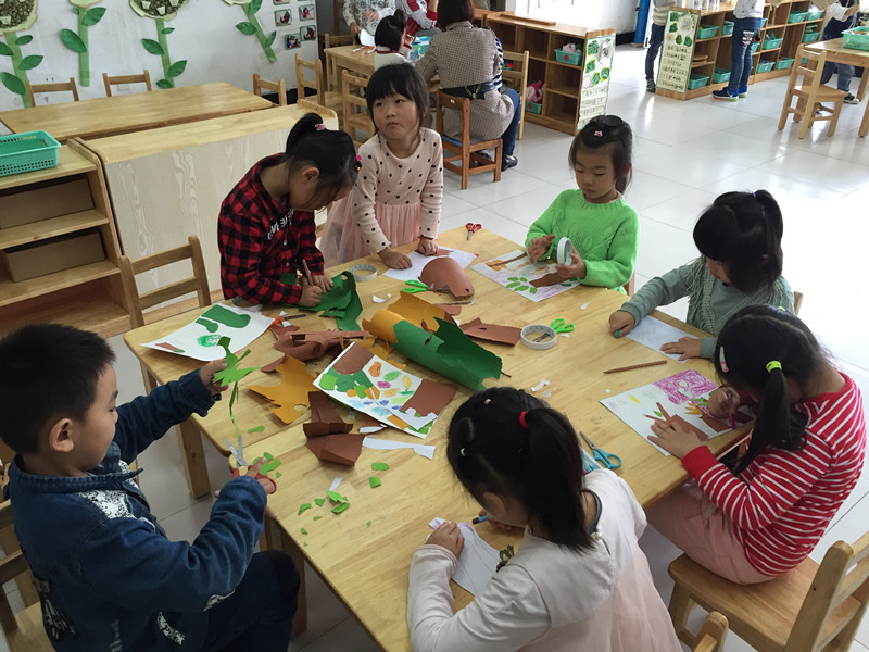 创想园里有多材料,我们可以自由的在里面创作,今天我们都在剪贴做大树。瞧!看我们一个个做的多认真,做的好开心呀!